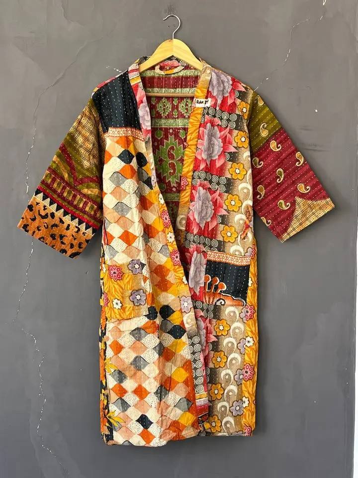 Vintage Kantha Kimono Robe for Women Floor-Length Printed Dressing Gown Free Size Washable Night Wear Dress