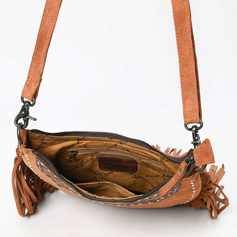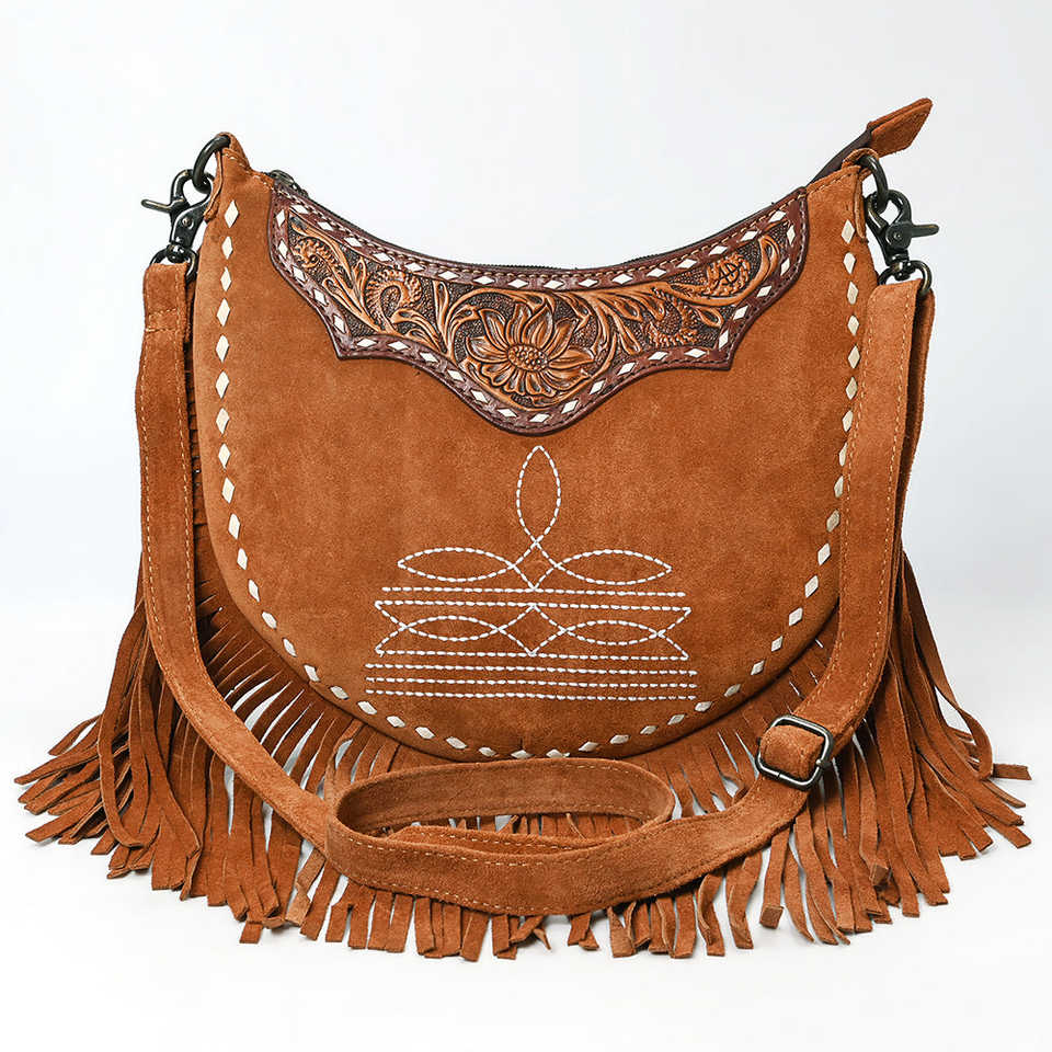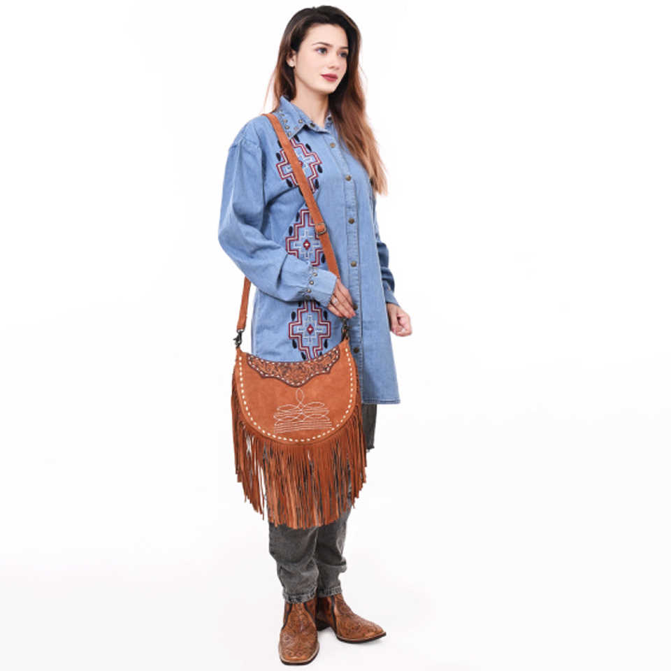 Vintage Lady Western Suede Fringe Crossbody Bag Tooled Leather Floral Yoke Embroidered Design Boho Cowgirl Shoulder Summer