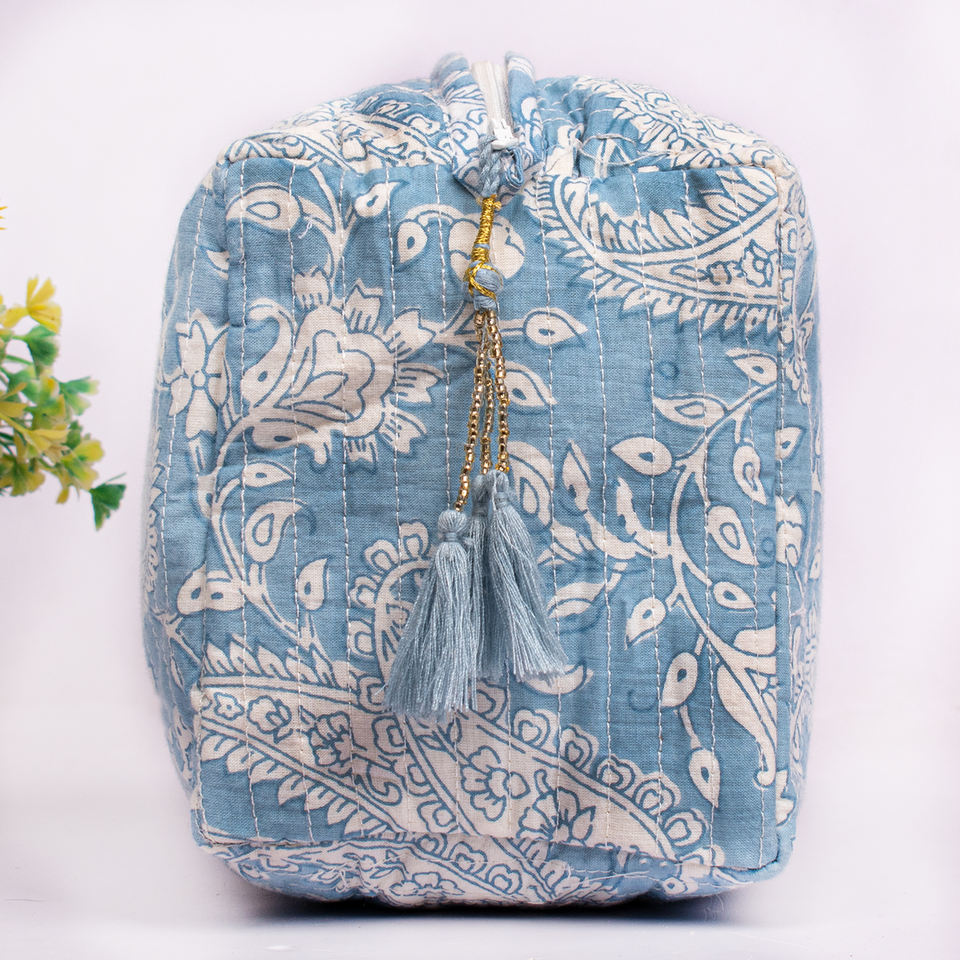 Vintage Large Cosmetic Quilted Cotton Eco-Friendly Reusable Portable Makeup Bag Hand Block Print Washable Zipper Pouch Fashion