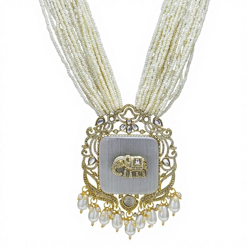 Vintage Long Imitation Pearl Silver Plated Necklace and Earring Set for Women Wedding Party Wear