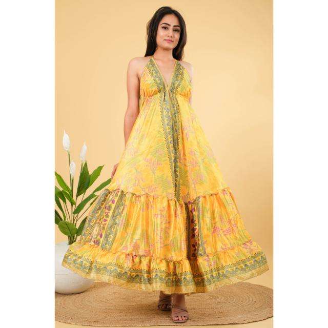 Vintage Maxi Silk Dress for Women Backless Beach Wear with Woven Patterns Free Size for Parties
