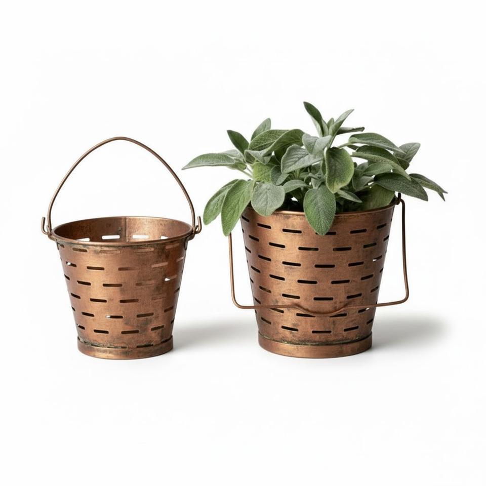 Vintage Metal Olive Bucket With Hook Farmhouse Hanging Planter & Basket With Slotted Sides Copper Antique Finished At Low Price