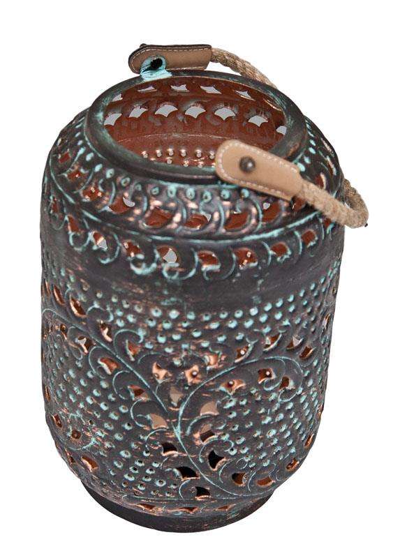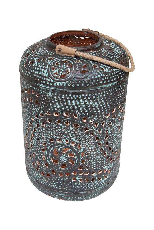 Vintage Moroccan Metal Lantern with Rope Handle Antique Verdigris Patina Tea Light Holder Iron Candle Lantern for Garden Wedding