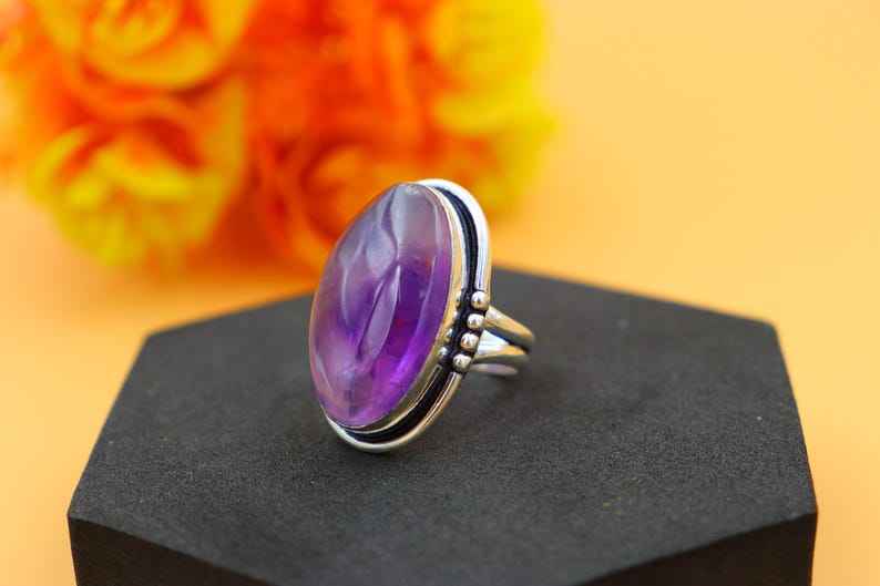 Vintage Natural Amethyst Gemstone Handmade Silver Oxidized Statement Big Stone Ring Simple Designer Ring