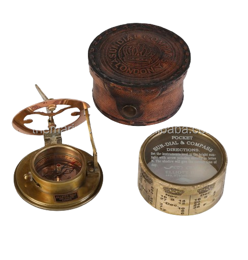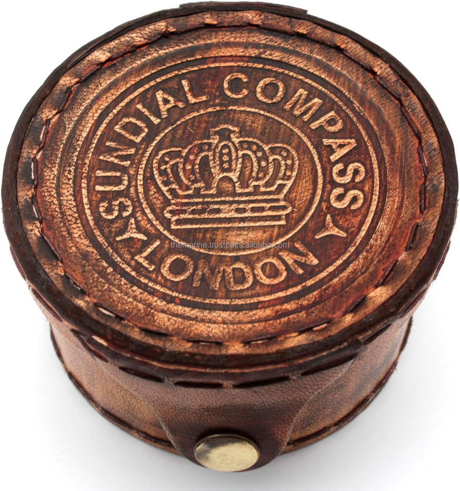Vintage Nautical Brass Drum Sundial Compass & Calendar Portable Outdoor Activity Guide with Round Leather Case Gifts Loved Ones