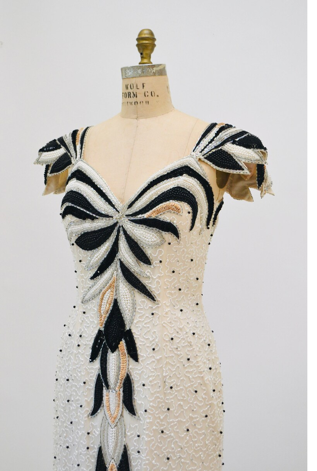 Vintage Off-White Silver Beaded Sequin Natural Waist Dress Modest Club Style for Pageant Wedding Party with Pearls by Talk Walk
