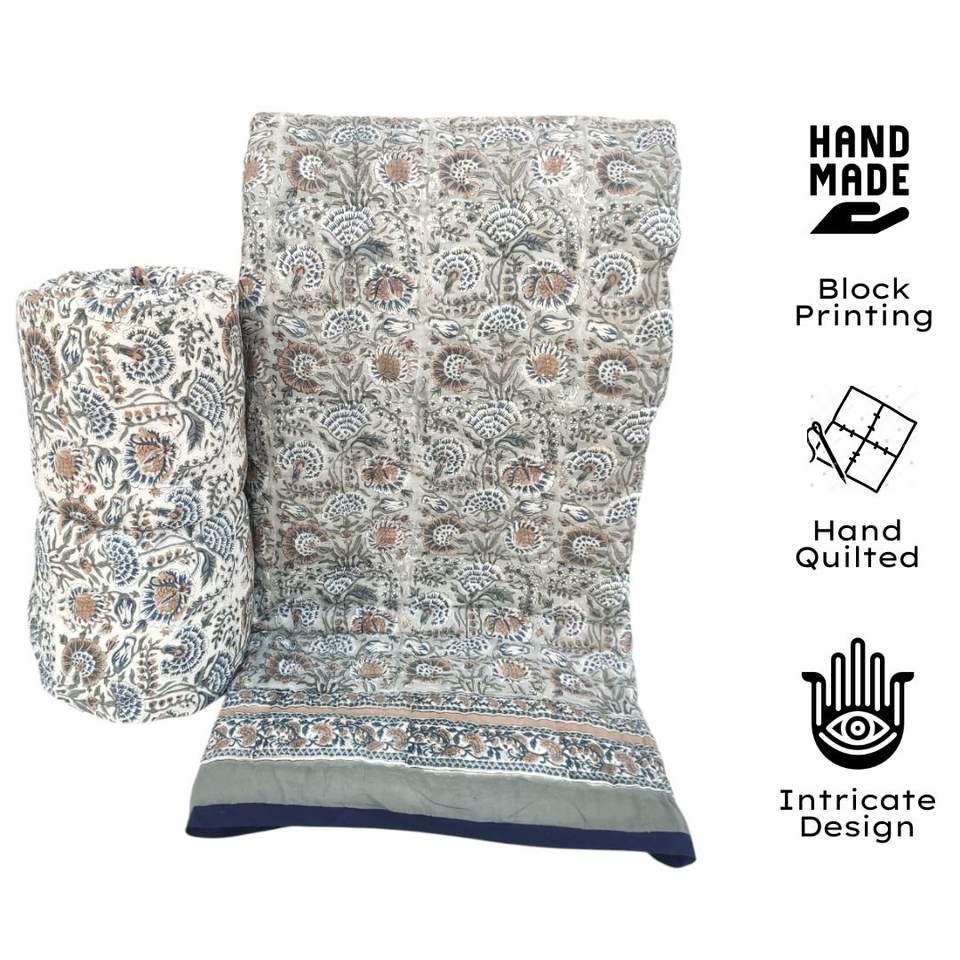Vintage Organic Grey Cotton King Size Reversible Soft Jaipuri Artisan Design Hand Block Print Double Bed Quilt Duvet Set