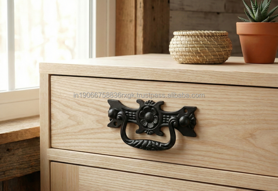Vintage Ornate Black Powder Coated Iron Drop Pull Handmade India Kitchen Dresser Cabinet Drawer Handle Durable Heavy Rustic