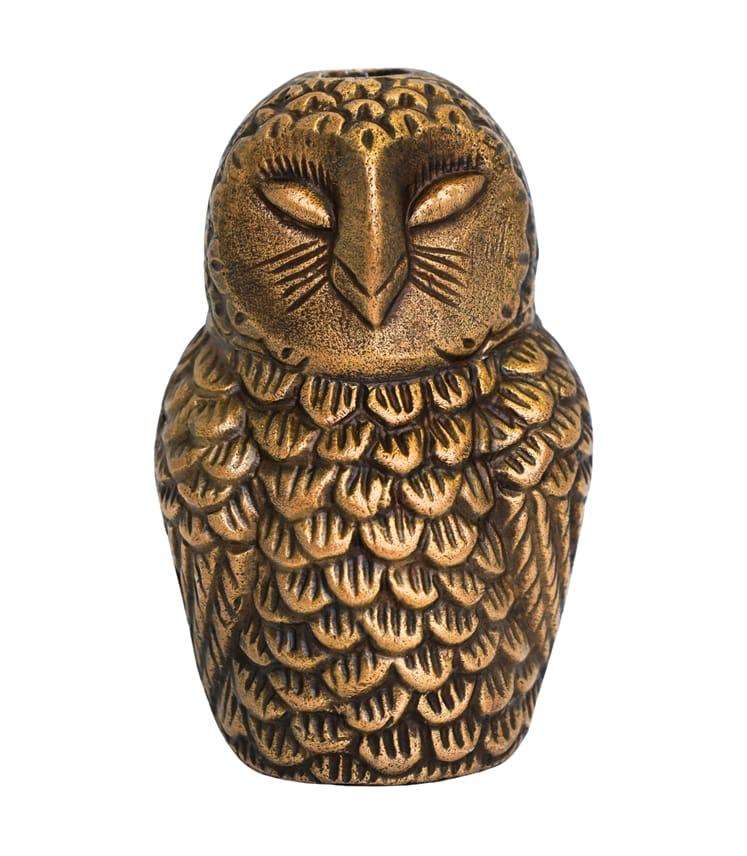 Vintage Owl Cast Aluminum Candlestick Holder in Antique Gold for Christmas Table Settings and Rustic Shelf Styling