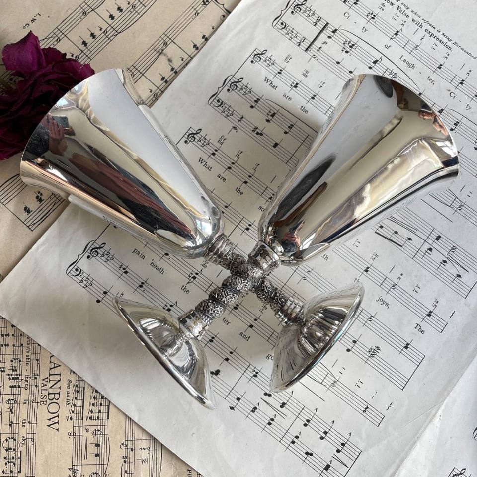 Vintage Pair of Silver Plated Luxury Elegant Handmade Long Stem Wine Goblets Falstaff Photo Props