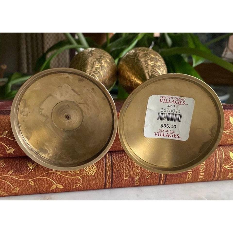 Vintage Pair of Solid Brass Goblets Floral Engraved Champagne Flutes - Original Sticker Tag Made in India