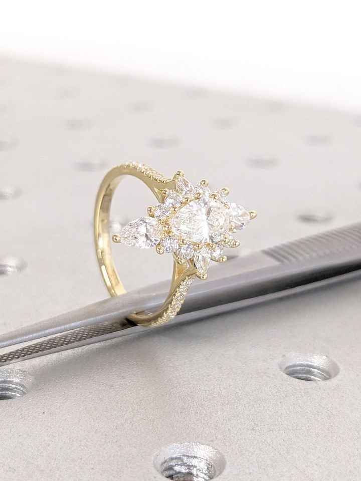 Vintage Pear Lab Grown Moissanite Engagement Ring Halo Floral Design Half Eternity Band 925 Sterling Silver Gold Plated