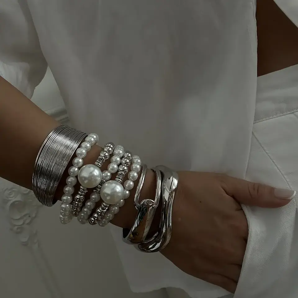 Vintage Pearl-Infused Wide Cuff Bracelets Fashionable Bangles for Women