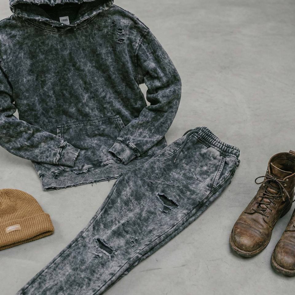 Vintage Printed Acid Wash Grey Tracksuit Grunge Aesthetic Distressed Hoodie Sweatpants Two Piece Set Streetwear 100% Cotton