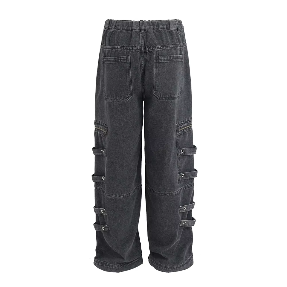 Vintage Punk Washed Workwear Jeans for Men Trendy Zipper Pocket Design Side Straps Distressed Solid Straight Leg Denim Pants