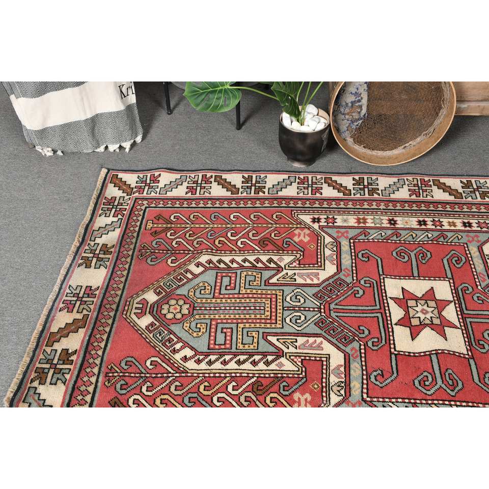 Vintage Red Beige Wool Rug 4.1 X 6.5 ft Kilim Style Large Area Turkish Rectangle Rugs Patchwork Abstract Hallway 10mm Latex