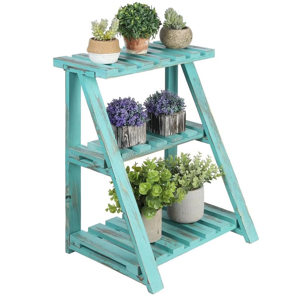 Product Name:Vintage Rustic Turquoise Wood 3 Tier Plant Rack