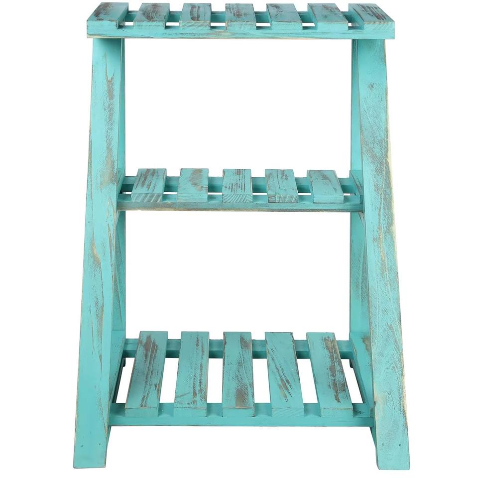 Vintage Rustic Turquoise Wood 3 Tier Plant Rack Small Organizer Shelf For Flower Pot Indoor Balcony Patio Decorative Display