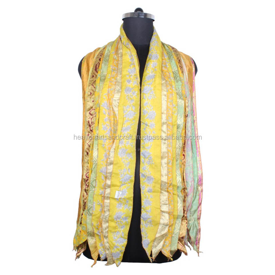 Vintage Silk Sari Recycled Scarf 10x70 Multi-Color Patchwork Stole Long/accessory for Women Plain with Striped Pattern-SC027