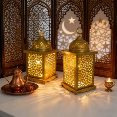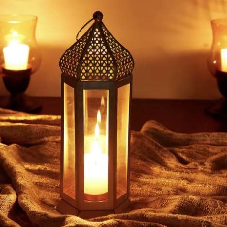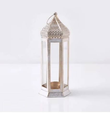 Vintage Silver Metal Moroccan Candle Lantern with Glass Panels Elegant Pierced Design Warm Ambient Glow for Home Decor