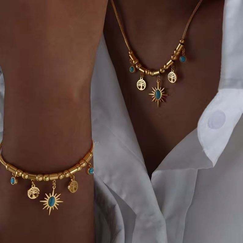 Vintage Stainless Steel 18k Gold Plated Sun Pendant Turquoise Charm Necklace for Women Retro Jewelry