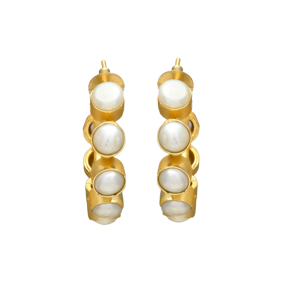 Vintage Statement Brass Gold Plated Earrings Small round Fresh Water Pearls Hoop Stud Type for Wedding