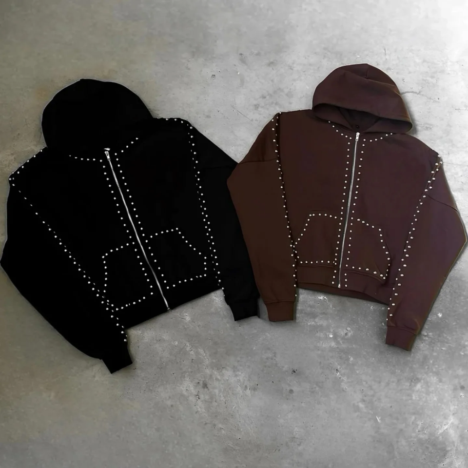 Vintage Street Oversized Zip-Up Hoodie 3D Printed Heavyweight Terry Puff with Rhinestones & Rivets 100% Cotton Winter Pattern