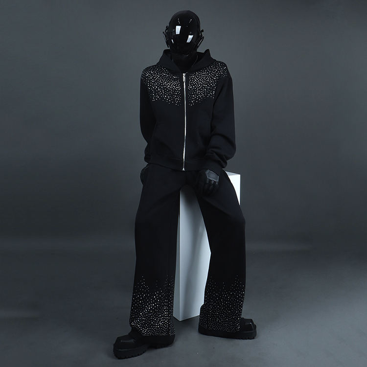 Vintage Street Style Breathable Heated 100% Cotton Winter Zip-Up Hoodie with French Terry Fabric 500 Gsm Distressed Rhinestones