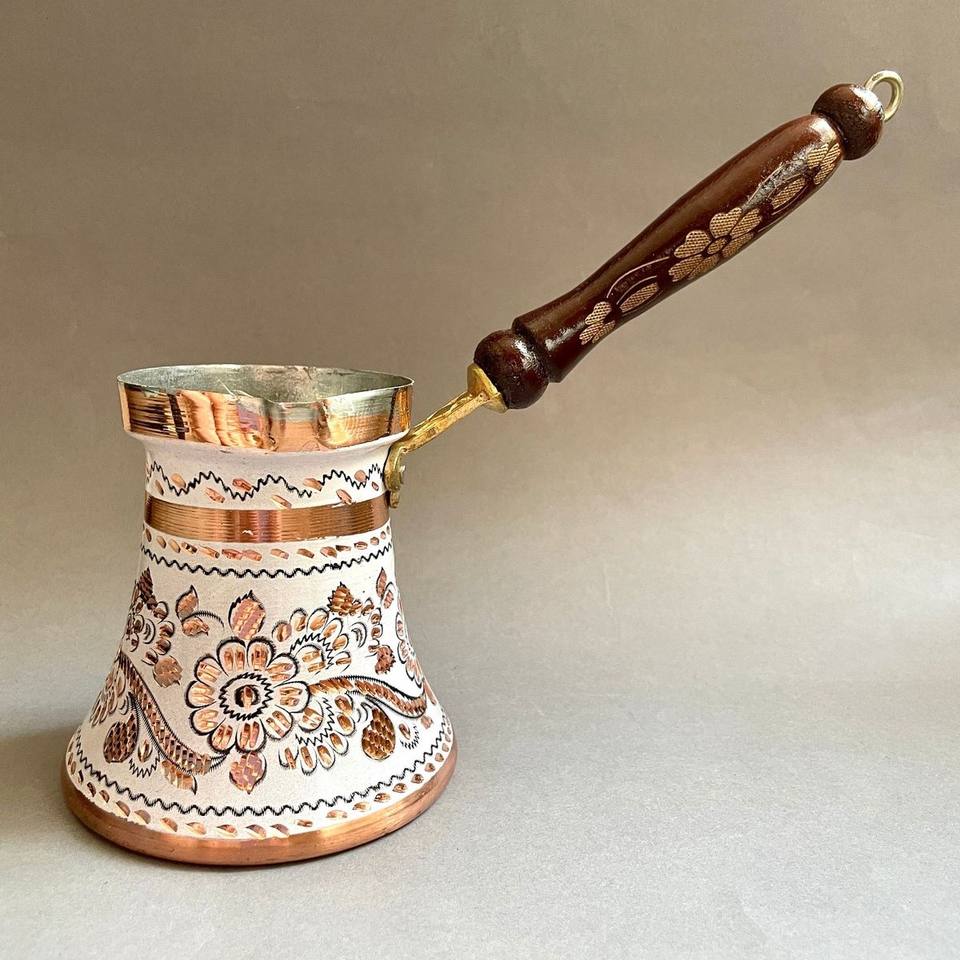 Vintage Style Brass Coffee Pot Enamel Artwork Wooden Handle Turkish Coffee, Espresso Style Brewing Luxury Table Presentation