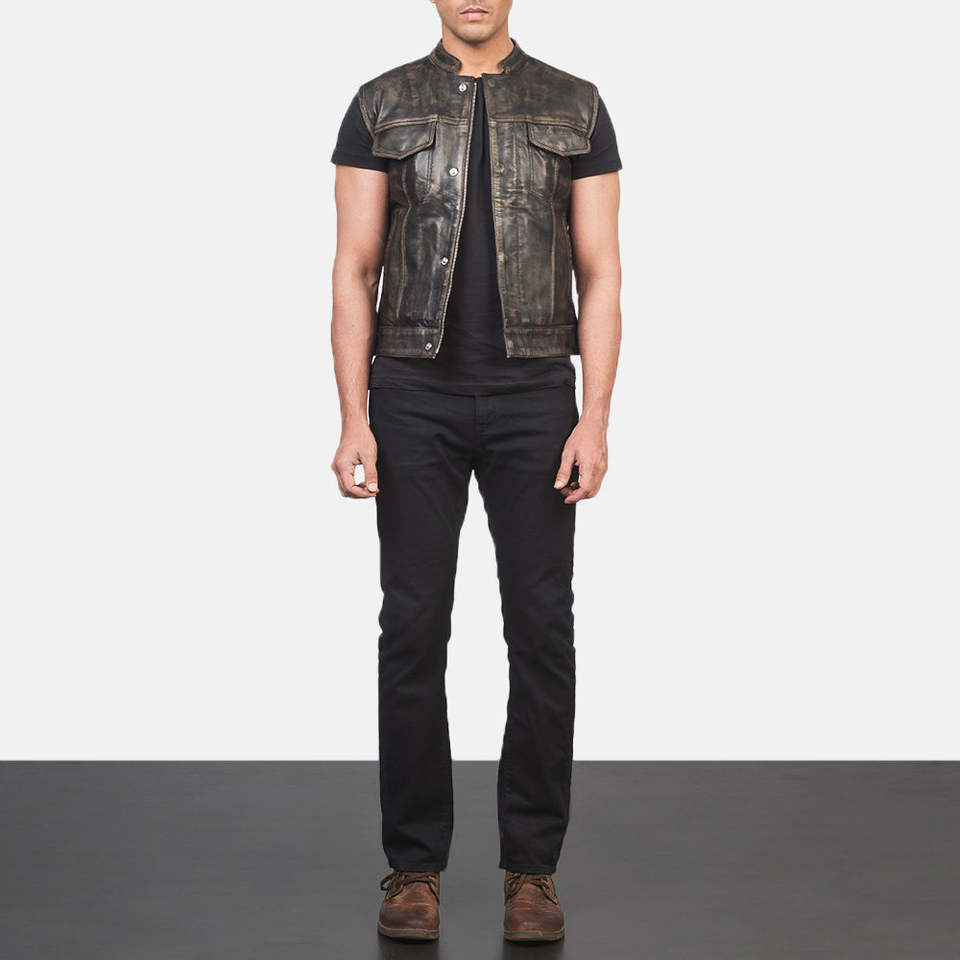Vintage Style Brown Leather Vest Heavyweight Cowhide Button Up Front Stand Up Collar Chest Pockets Biker Vest