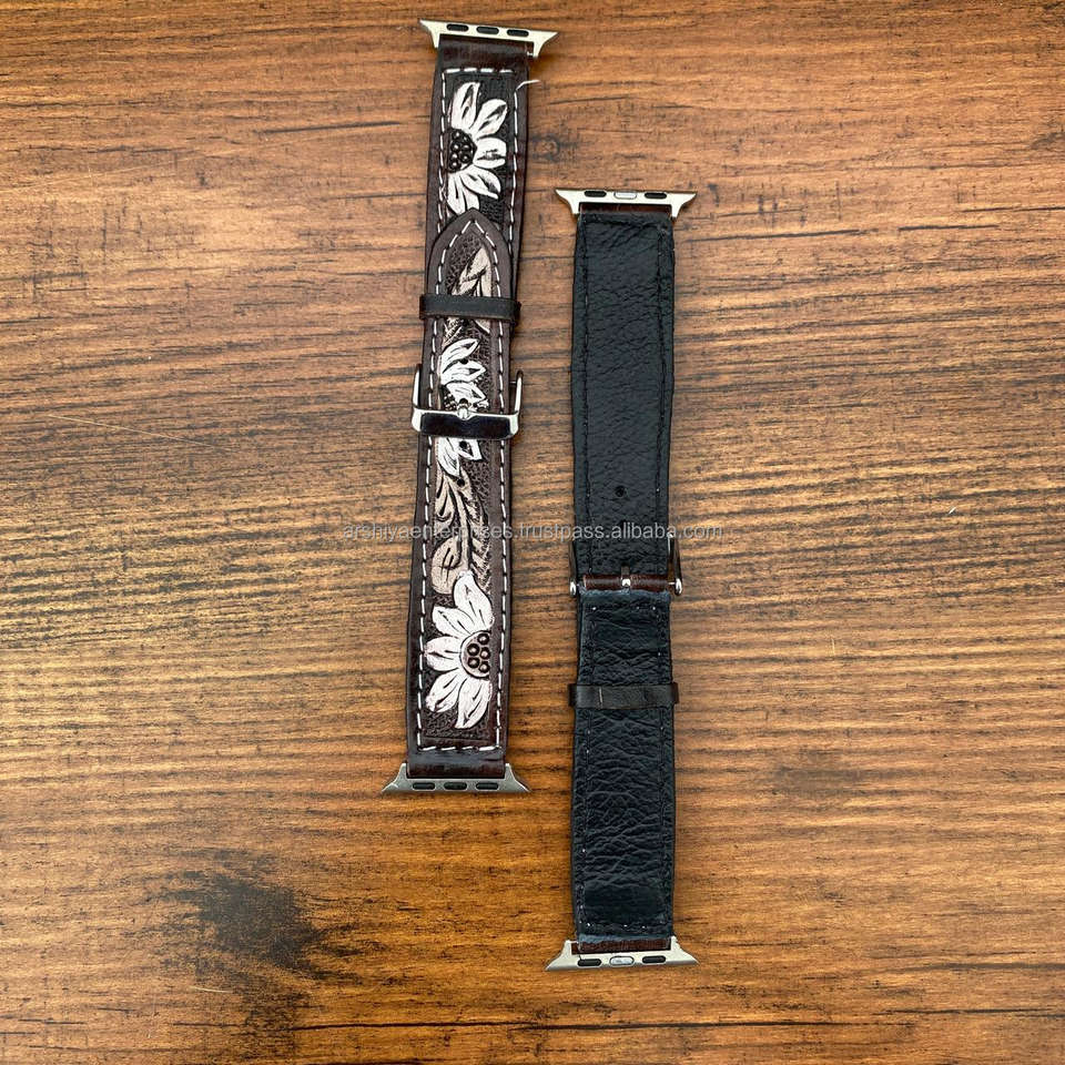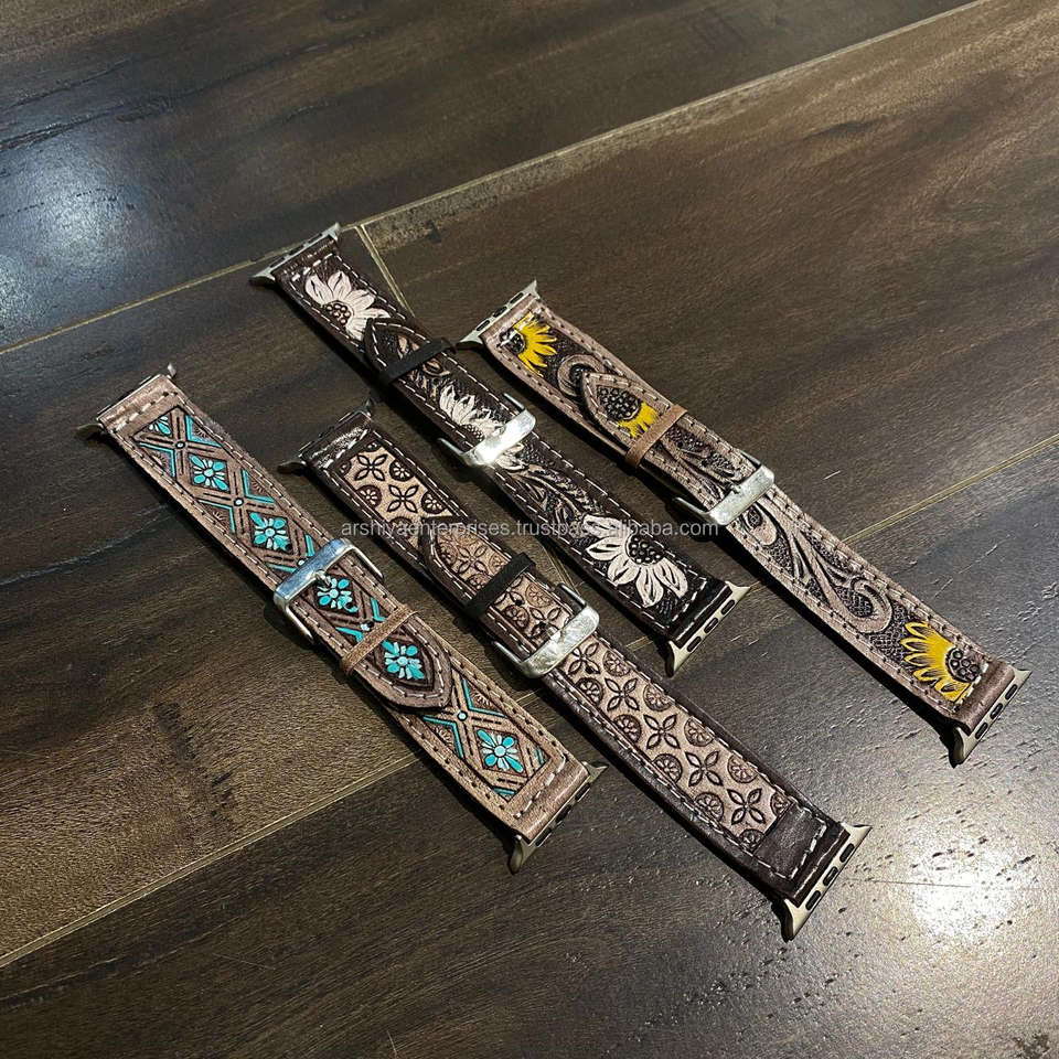 Vintage Style Hand Tooled Genuine Leather Watch Bands with Custom Floral Carving Plain Strap Design for Men &Women Smart Watches