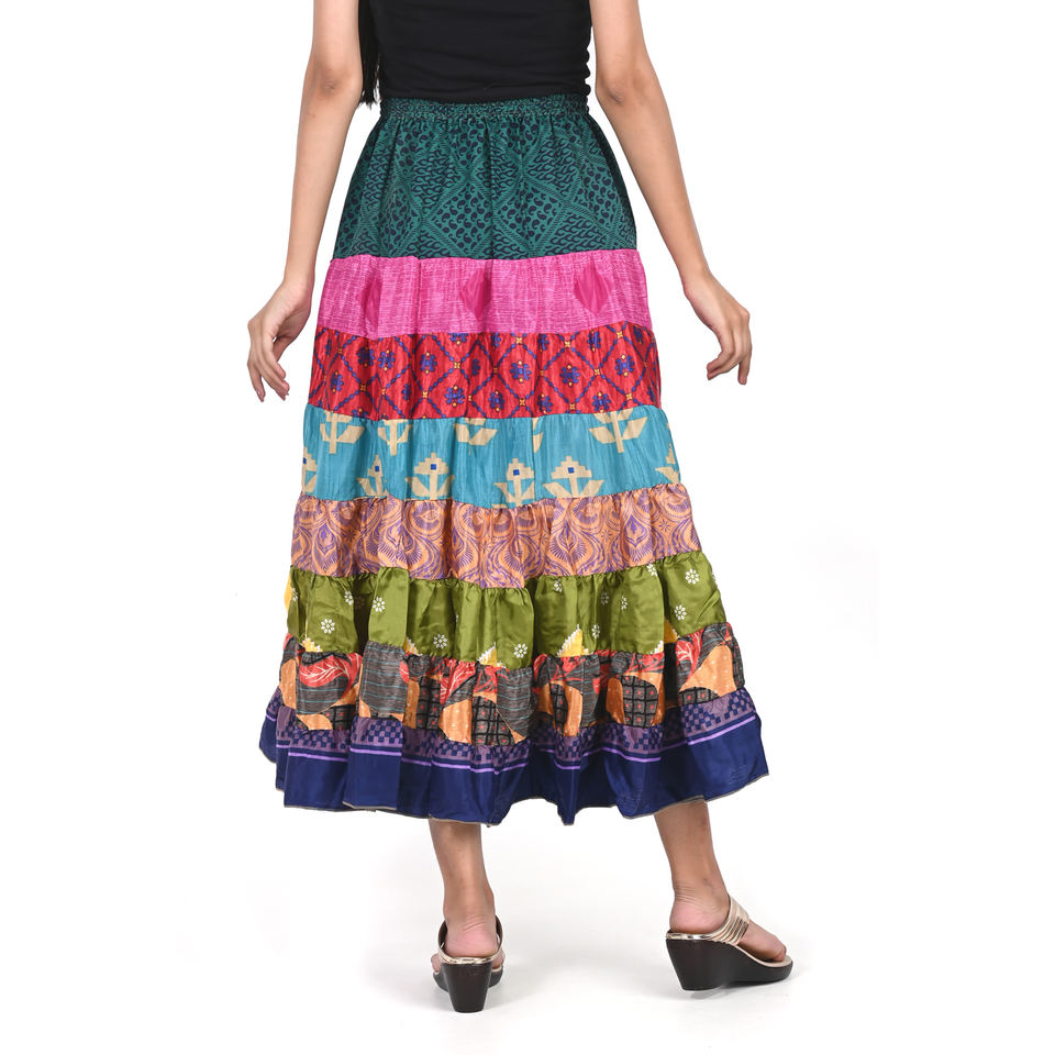 Vintage Style Indian Gypsy Long Skirt Multicolor Patchwork Adjustable Elastic Waistband Sari Fabric Boho Maxi Skirt