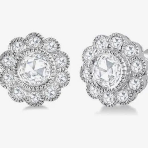 Vintage Style Rose Cut Diamond Earrings Floral Halo Studs 18k White Gold Plated Moissanite Jewelry Custom Wholesale Manufacturer
