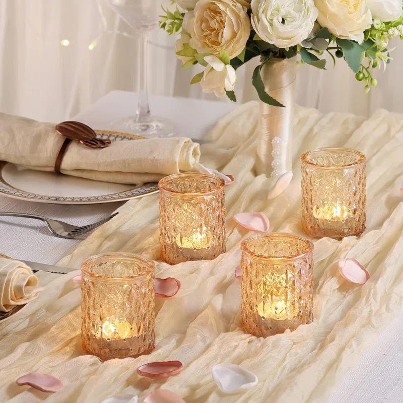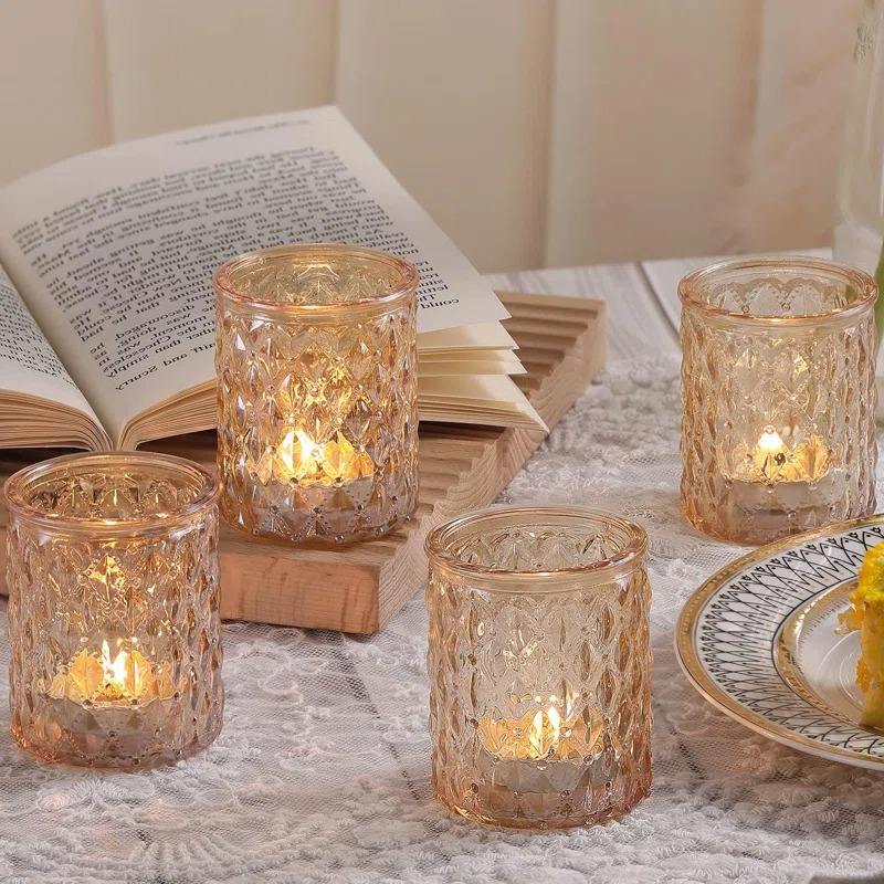 Vintage Style Rose Gold Quilted Glass Tea Light Holder Bridal Shower Easter Centerpieces Elegant Amber Embossed Diamond Pattern