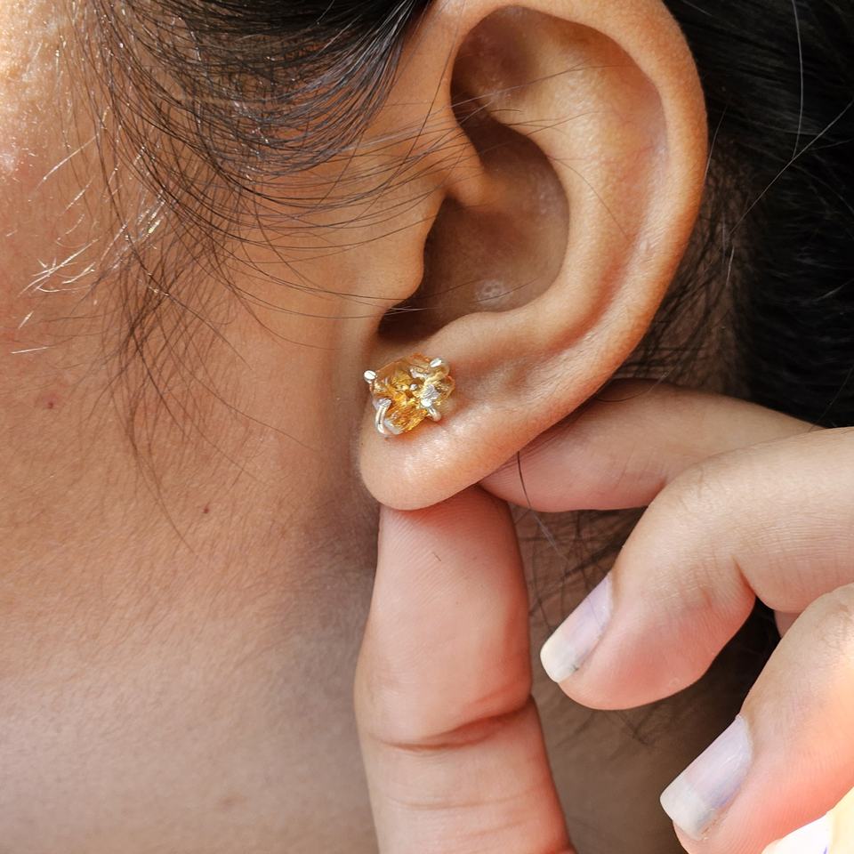 Vintage Style Silver Stud Earrings with Citrine Rough Gemstone Lightweight for Engagement Wedding Anniversary or Gift