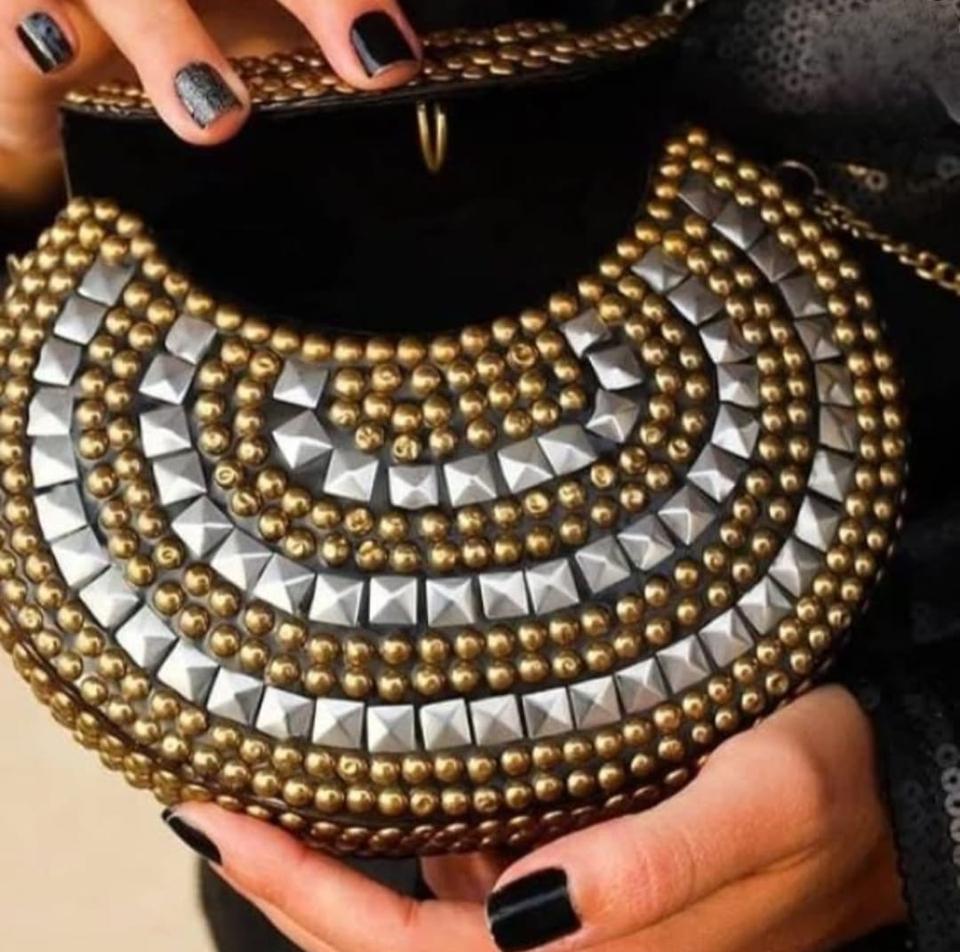 Vintage Style Women's Handbag Clutch Purse With Silver & Golden Stud With Silver Strap Chain also Wedding & Birthday Party Event