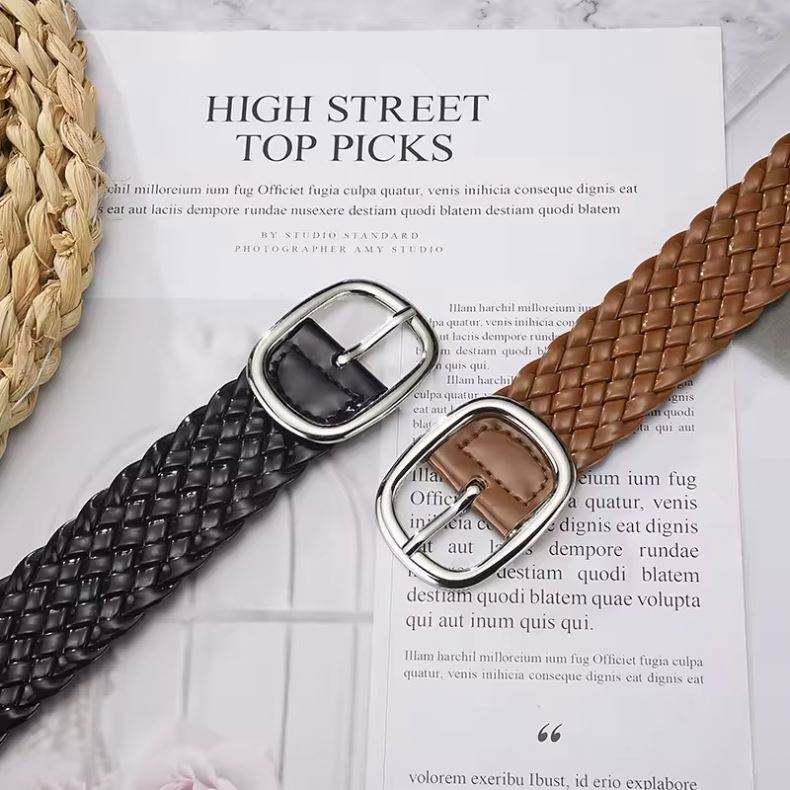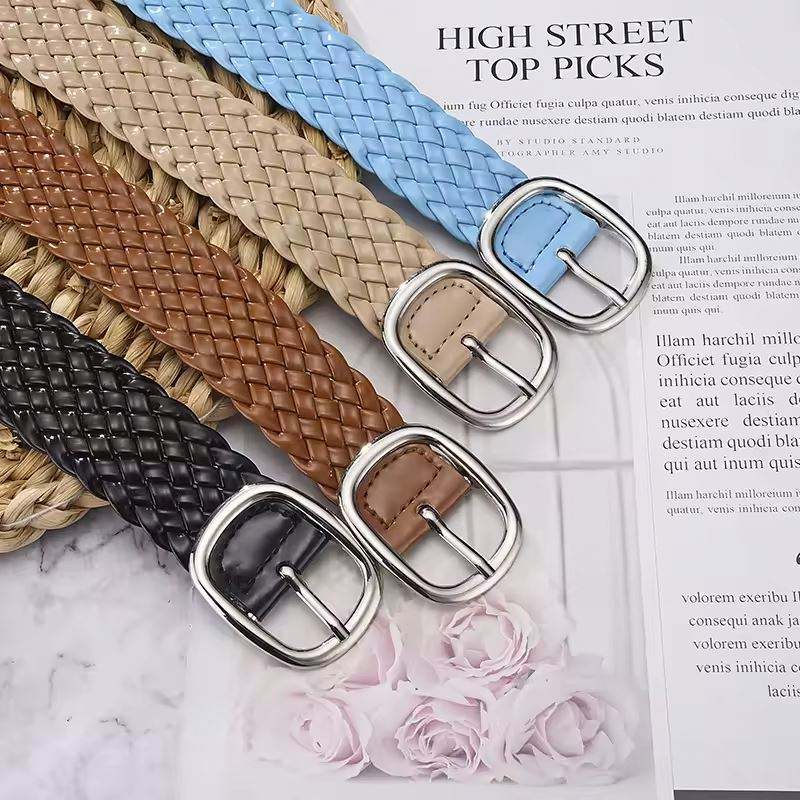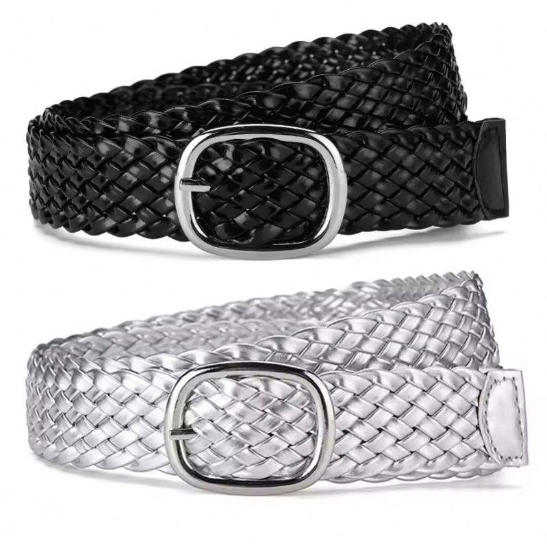Vintage Style Women's PU Leather Braided Belts Casual Fashion Black with Gold Alloy Buckle for Men
