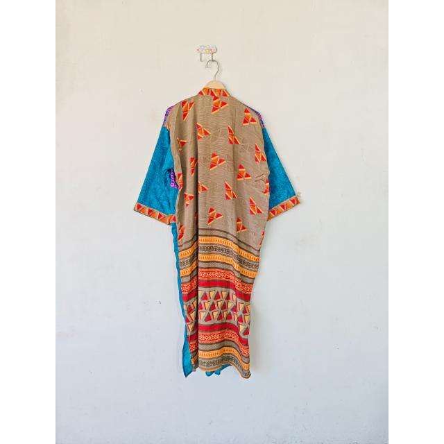 Vintage Thermal Silk Sari Kimono Robe Flower Design Beach Wear Long Jacket Summer Sleepwear Dressing Gown and Nightgown Wrap