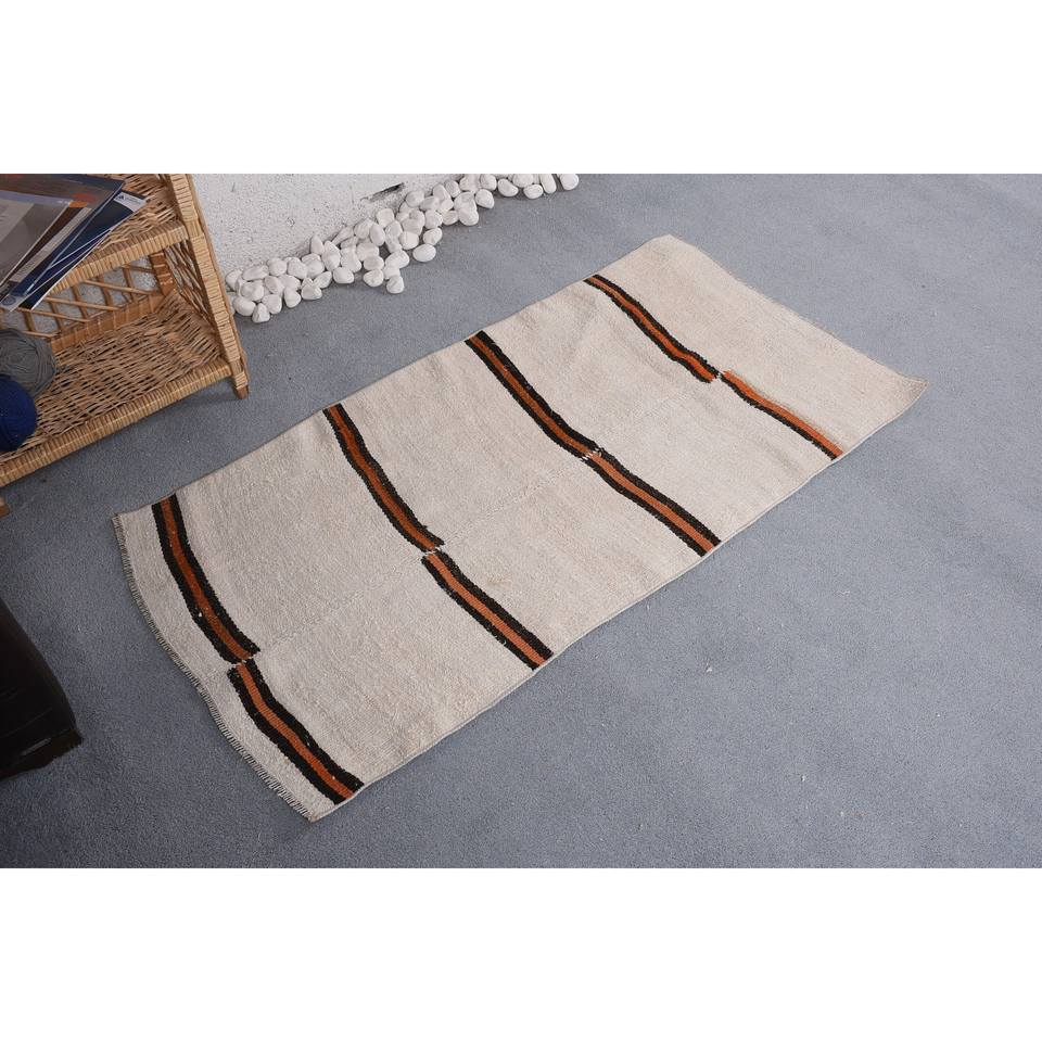 Vintage Traditional Wool Rug Beige and Brown Striped (2,2 X 4,3 Ft) Patchwork Pattern with Latex Backing