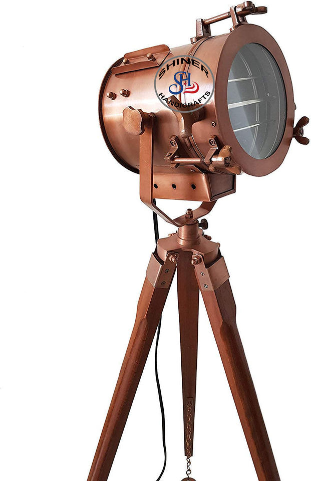 Vintage Tripod Floor Lamp Nautical Copper Retro Spotlight Industrial Wooden Light Fixtures Cinema Movie Home Decor