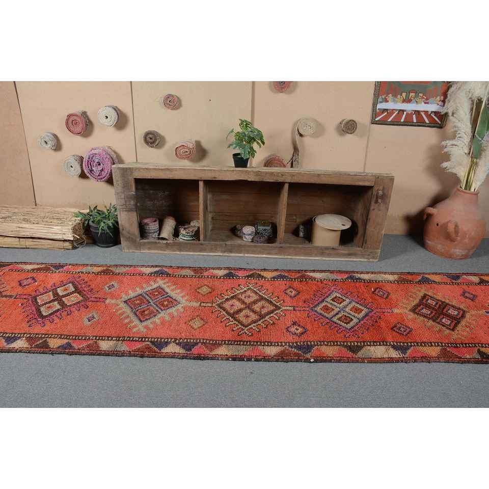 Vintage Turkish Classic Style Rectangle Rug 2.7ft X 13.6ft Orange Brown Bohemian Patchwork Design Flat Weave Wool Latex Backing