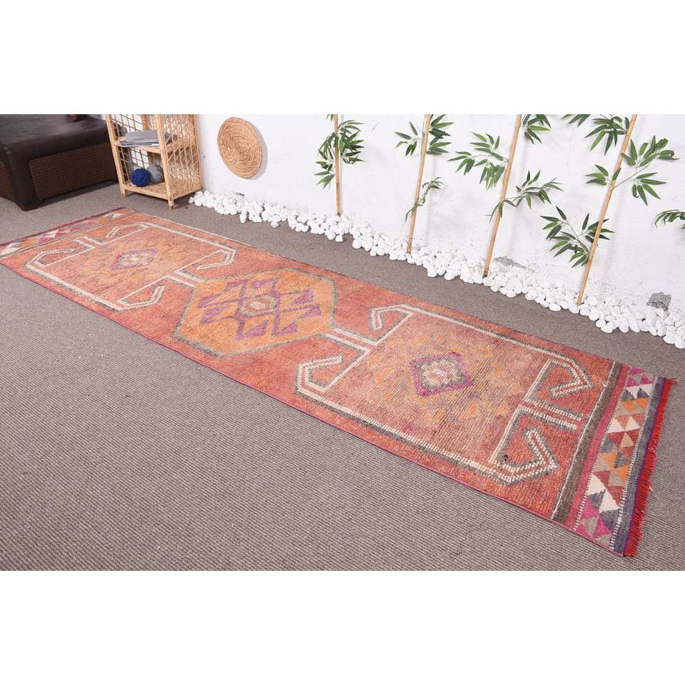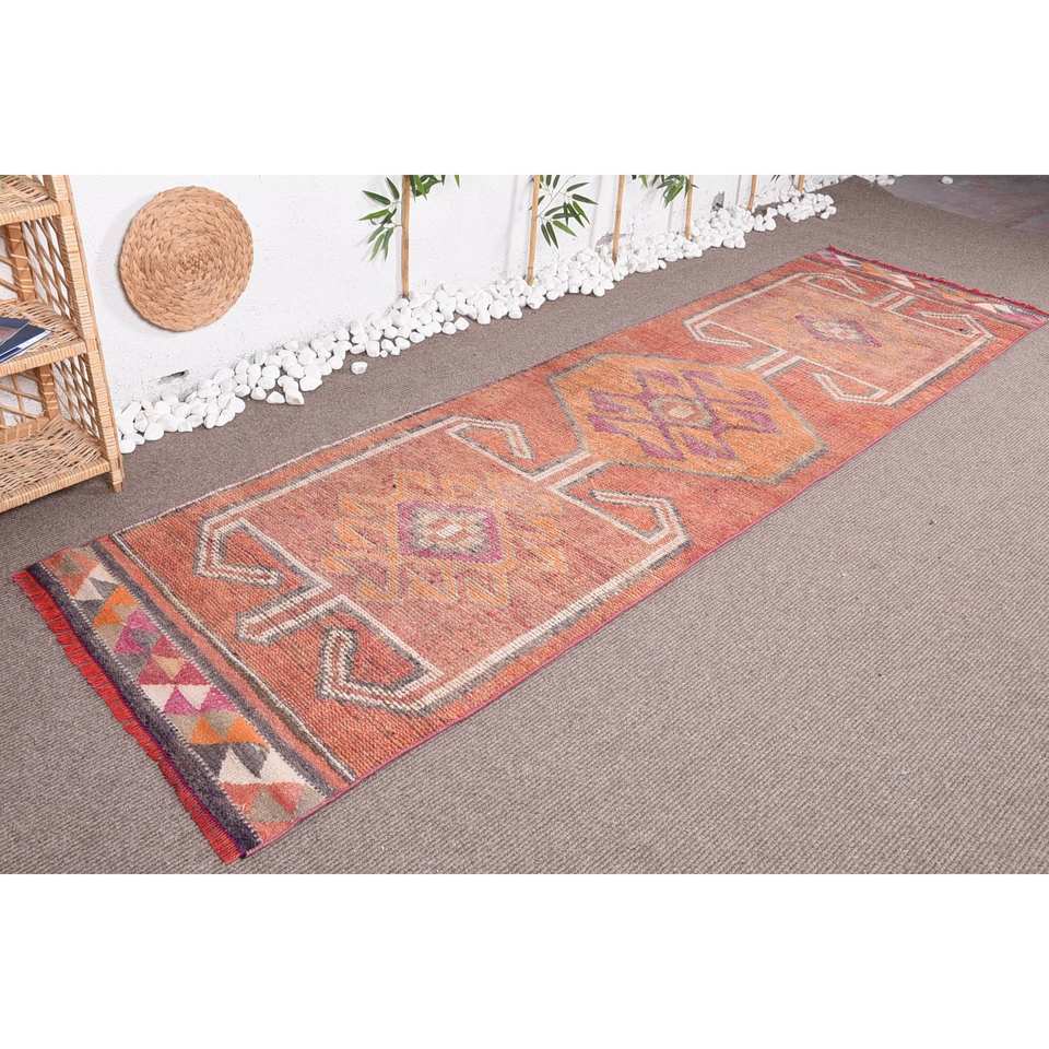 Vintage Turkish Design Kilim Rug in Orange Red 3 X 10.6ft Wool Viscose Material with Latex Backing Patchwork Pattern for Teens