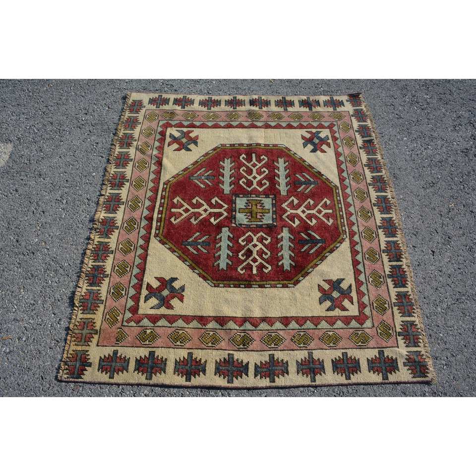 Vintage Turkish Kilim Red Beige Rug 4.5 X 3.9 ft 10mm Wool Latex Backing Patchwork Striped Design for Living Room Hallway New