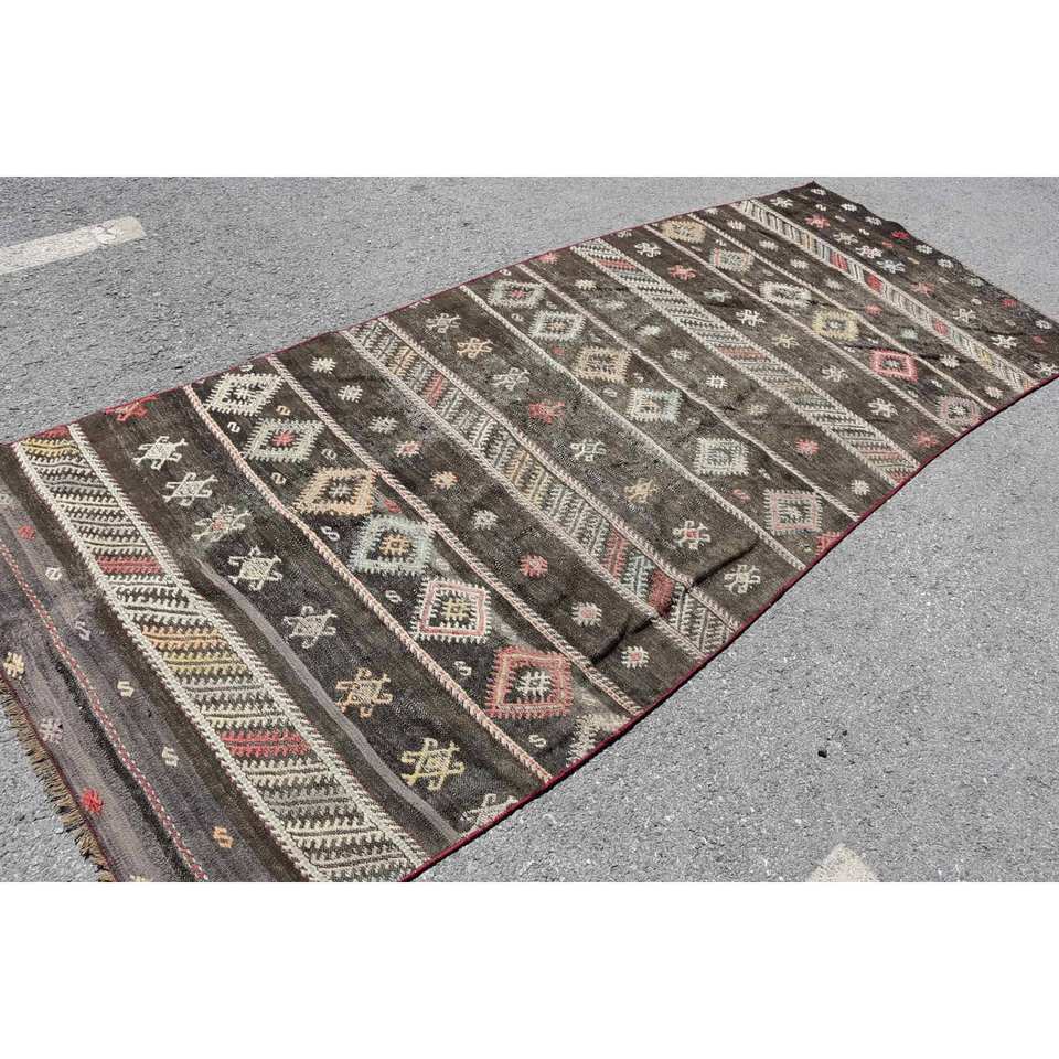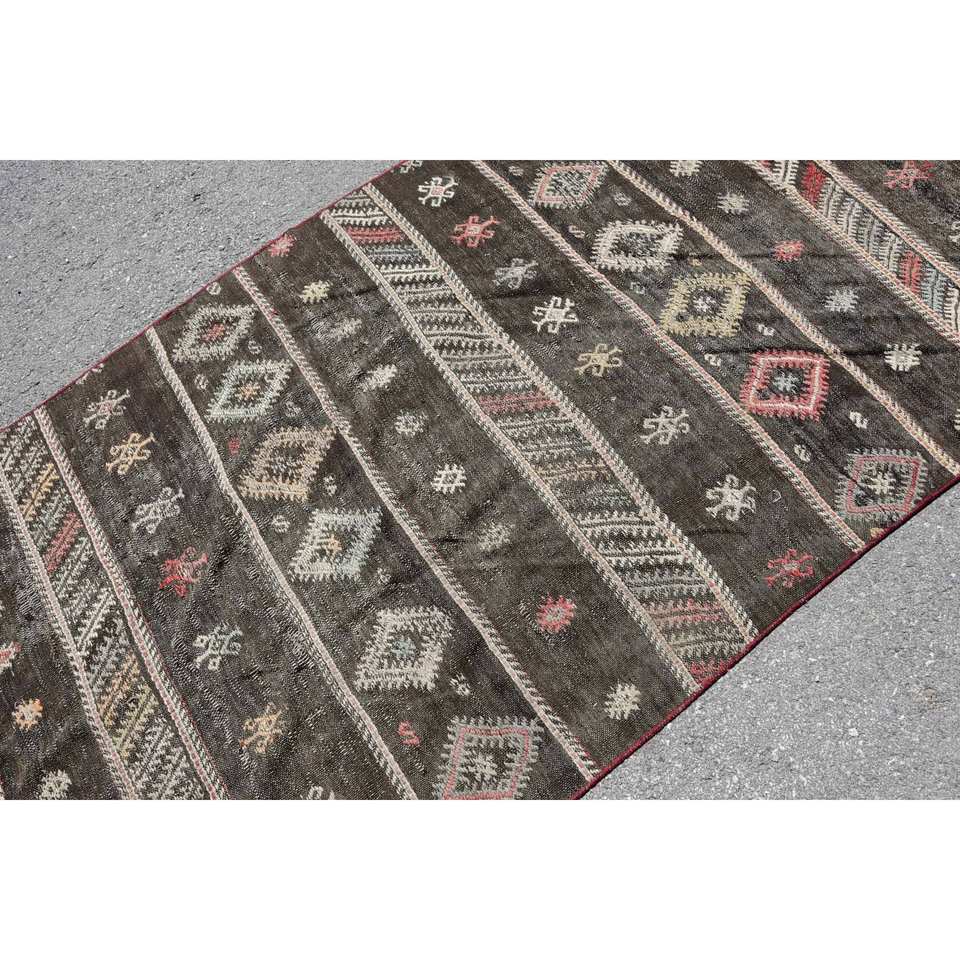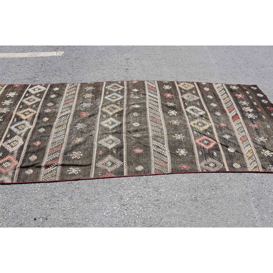 Vintage Turkish Kilim Rug 4.2 X 10.8 ft Brown Beige Wool with Latex Backing Flat Weave Boho Style Patchwork Pattern for Hallway
