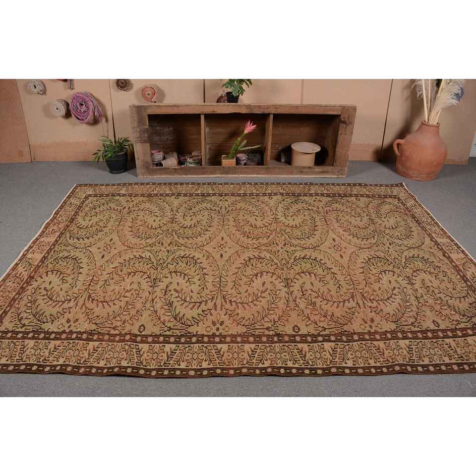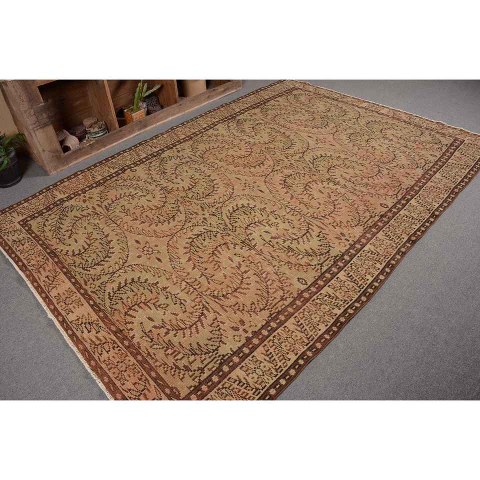 Vintage Turkish Kilim Rug Beige Brown 6.3 X 9.2ft Handmade Wool Latex Backing Classic Patchwork Design for Living Room High