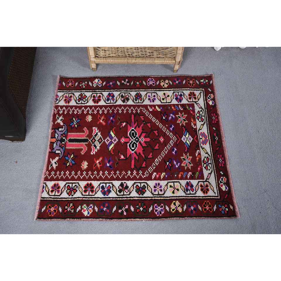 Vintage Turkish Kilim Wool Rug Eco Friendly Medium Pile Large Area Rectangle Patchwork Design 2.7 X 2.8ft Red Latex Backed