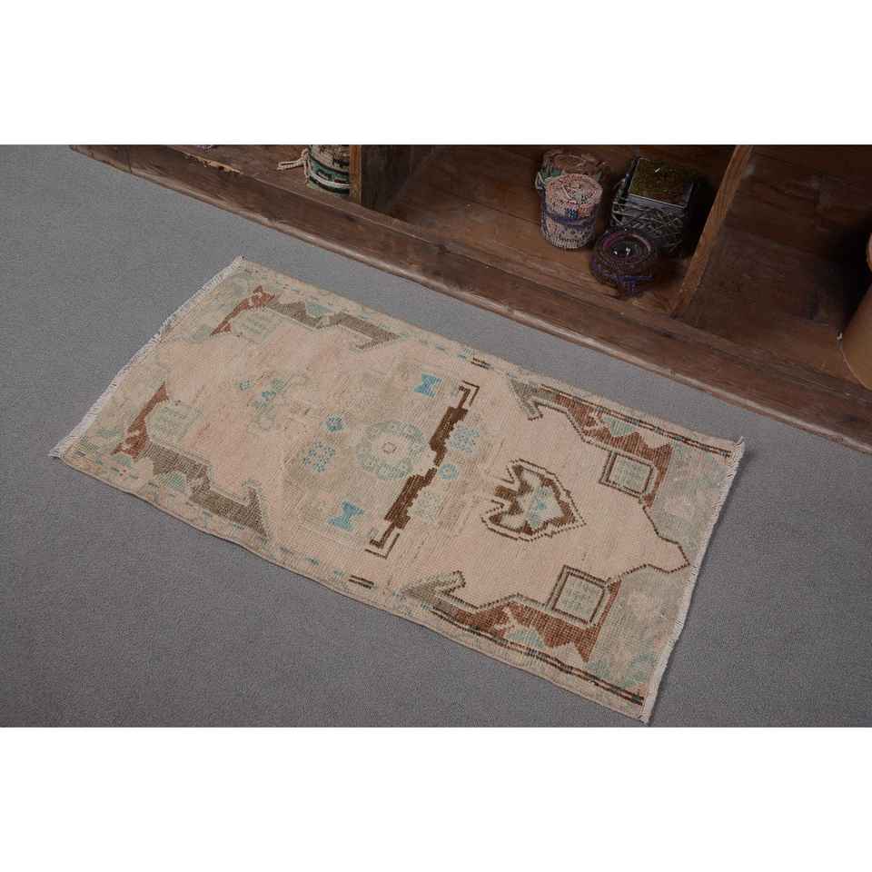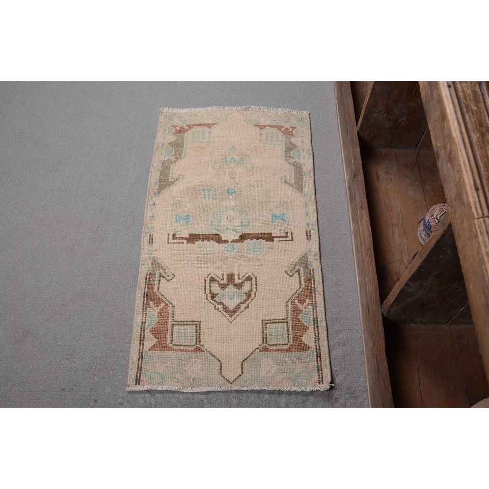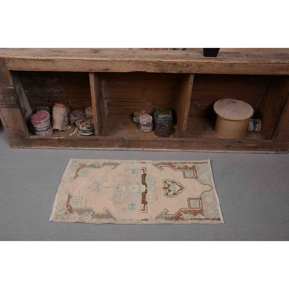 Vintage Turkish Rug 1.6x2.9ft Beige Blue Flat Weave Wool with Patchwork Pattern for Living Room Decorations or Hallway Use