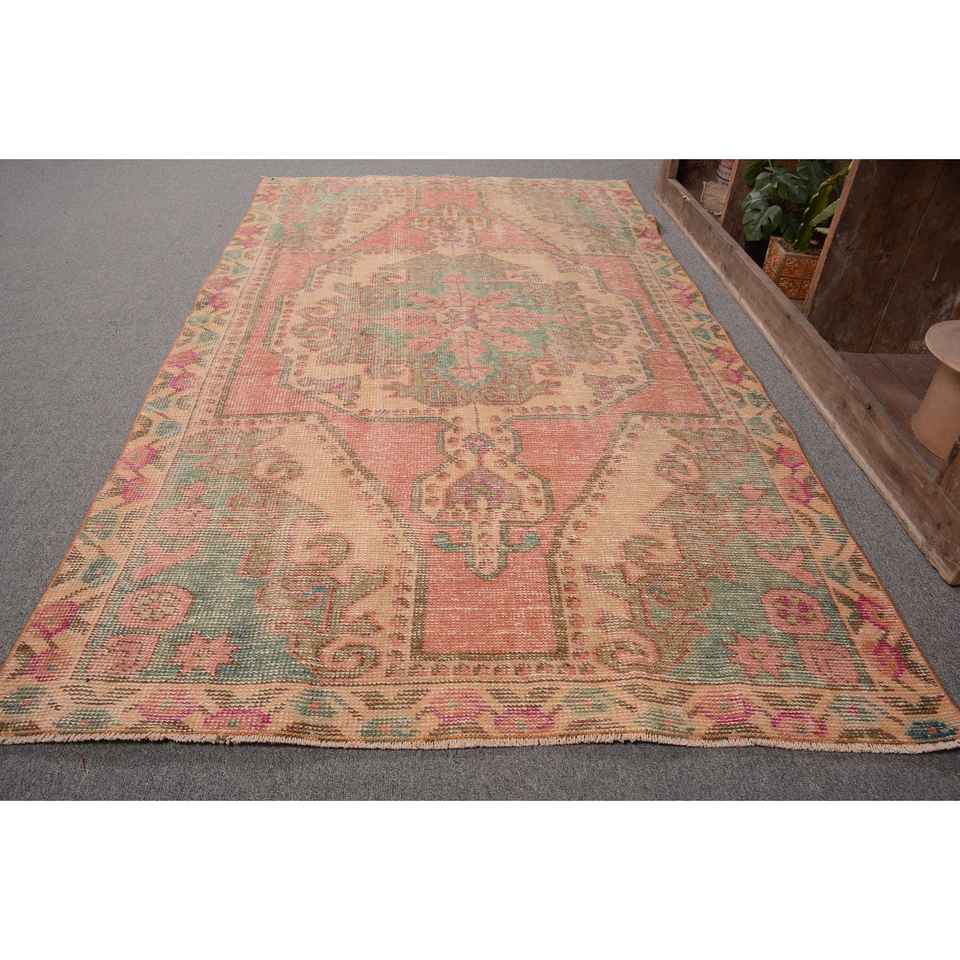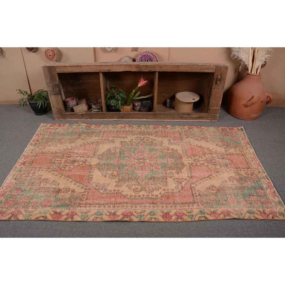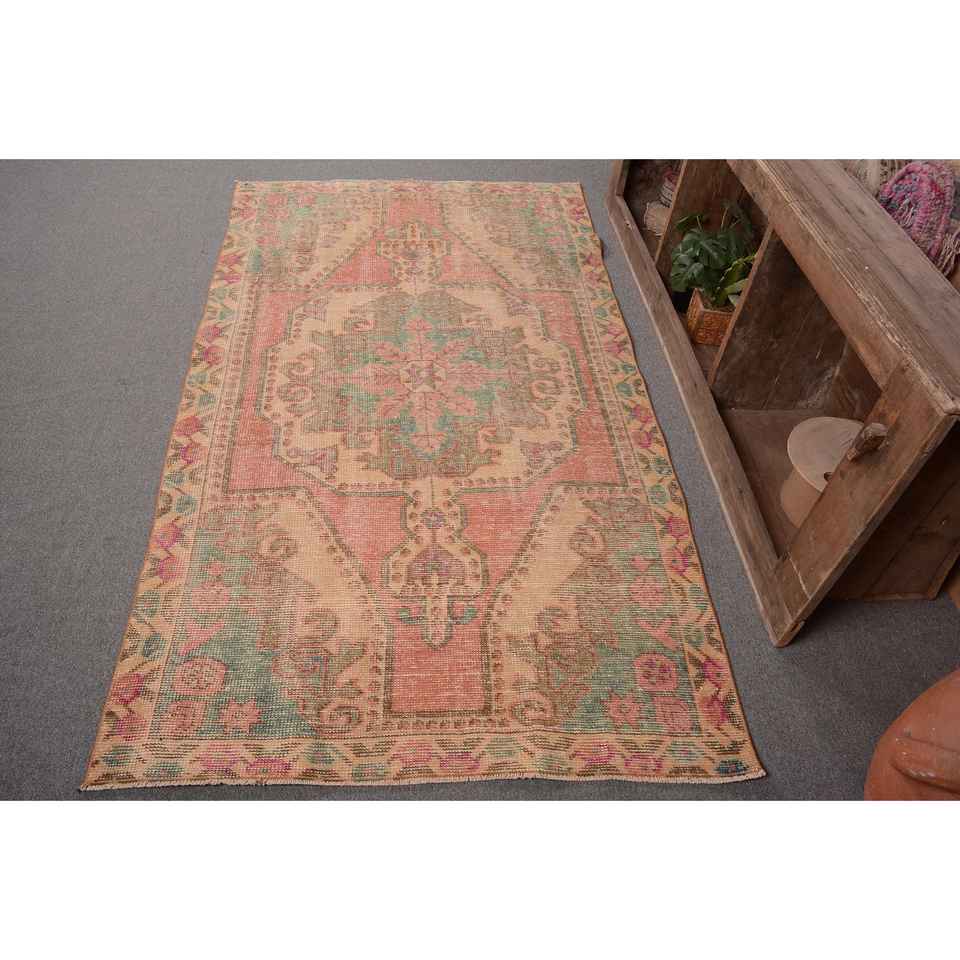 Vintage Turkish Rug 3.7 X 7 ft Classic Large Area Patchwork Design Pink Green Wool Material Latex for Teens Hallway Rectangle
