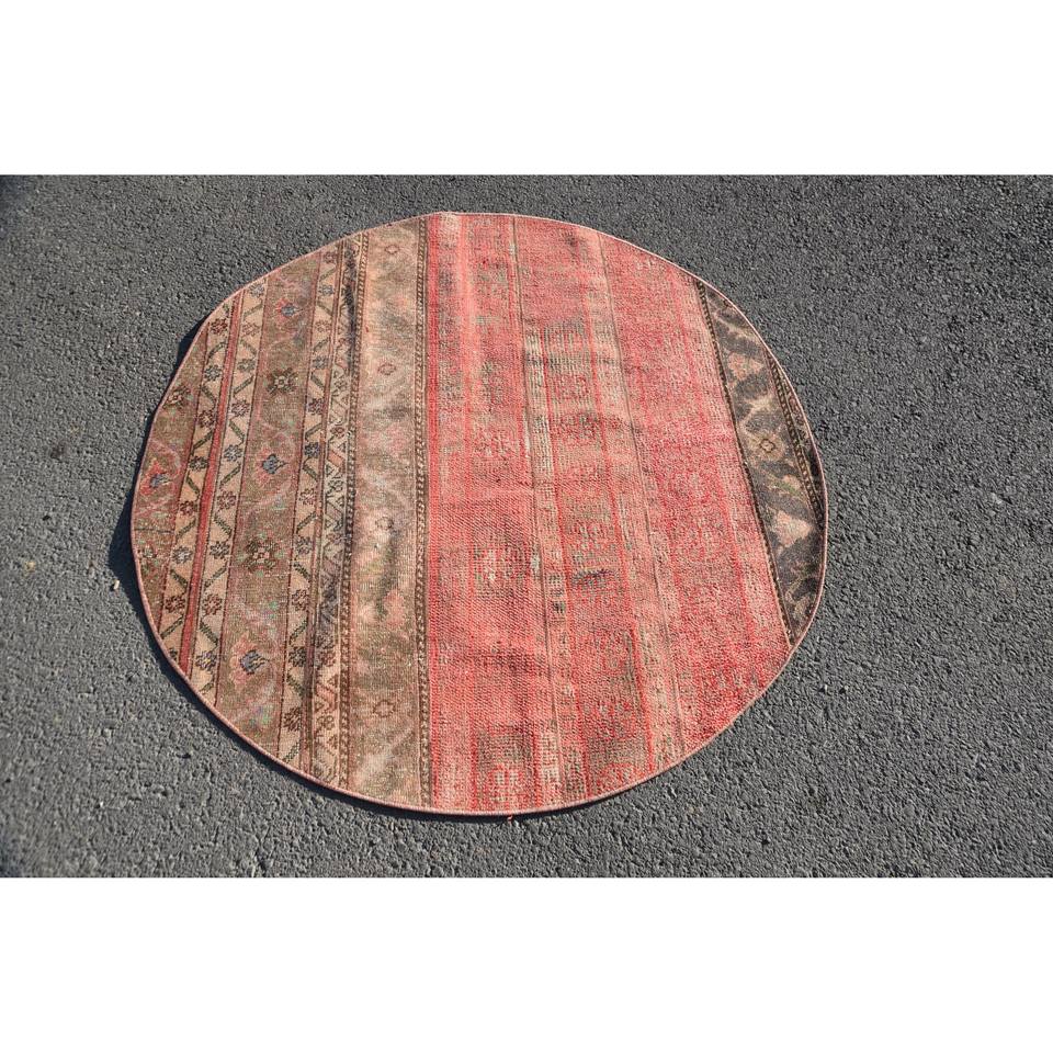 Vintage Turkish Rug 4.4 X 4.4ft Large Area Red Beige Wool Patchwork Design for Hallway Bedroom Rectangular Shape Latex Backing