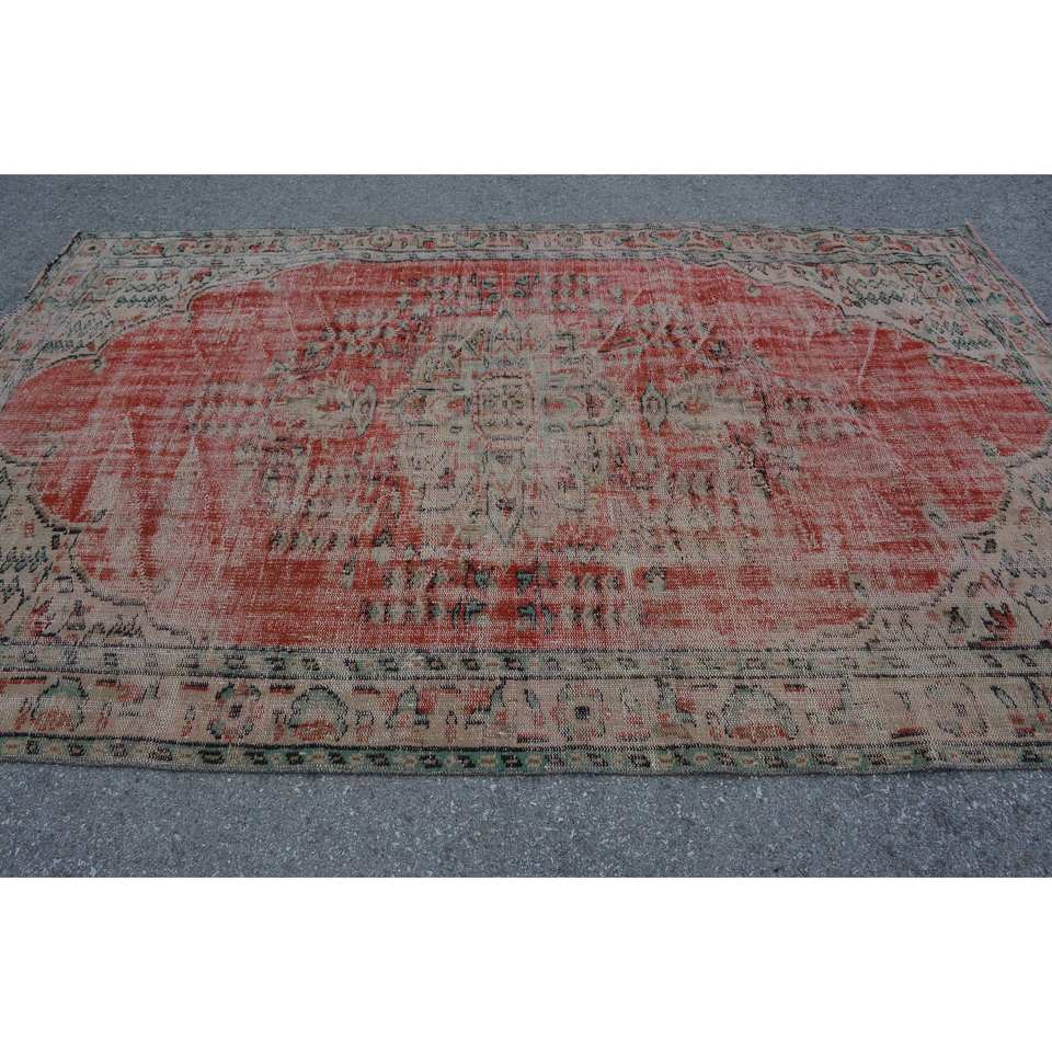 Vintage Turkish Rug 5.8 X 9.2ft Red Beige Wool Large Area with Patchwork Design for Hallway or Bedroom Latex Backed